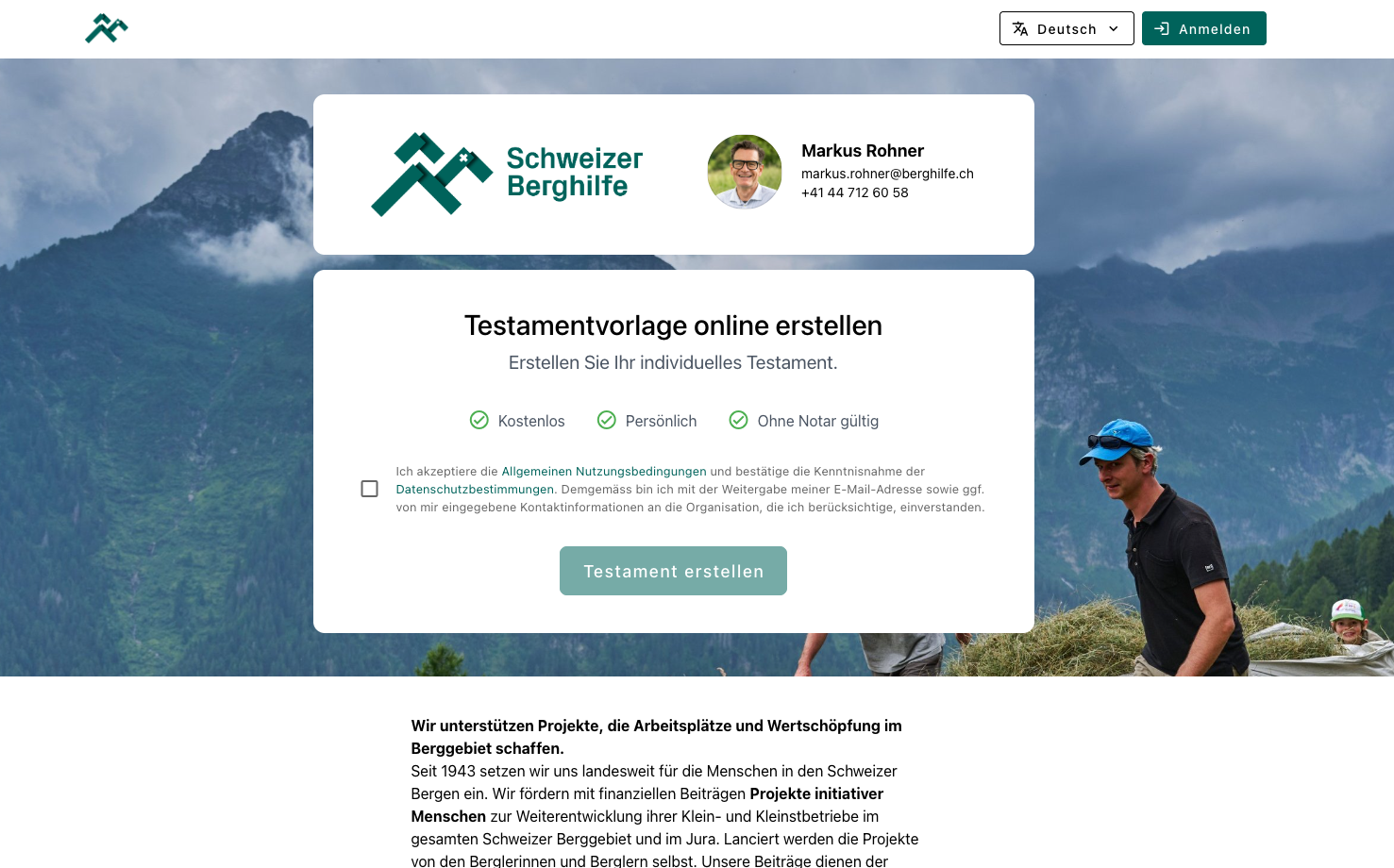 - Ziel: app.deinadieu.ch (Schweiz); app.testamentservice.de (Deutschland); app.testamentservice.at (Österreich)
