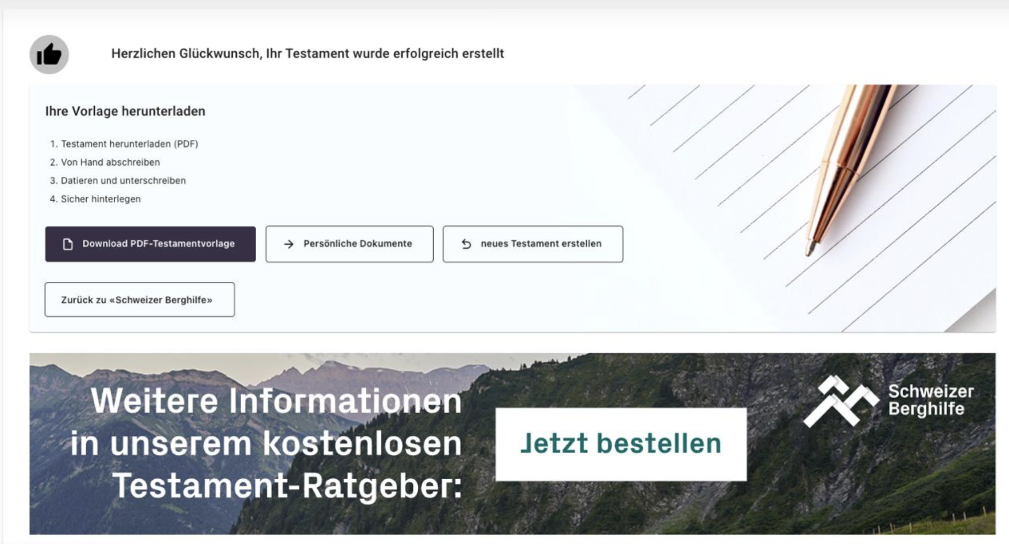 - Auch die Abschlussseite des Testament Assistenten kann angepasst werden - hier ein Beispiel: