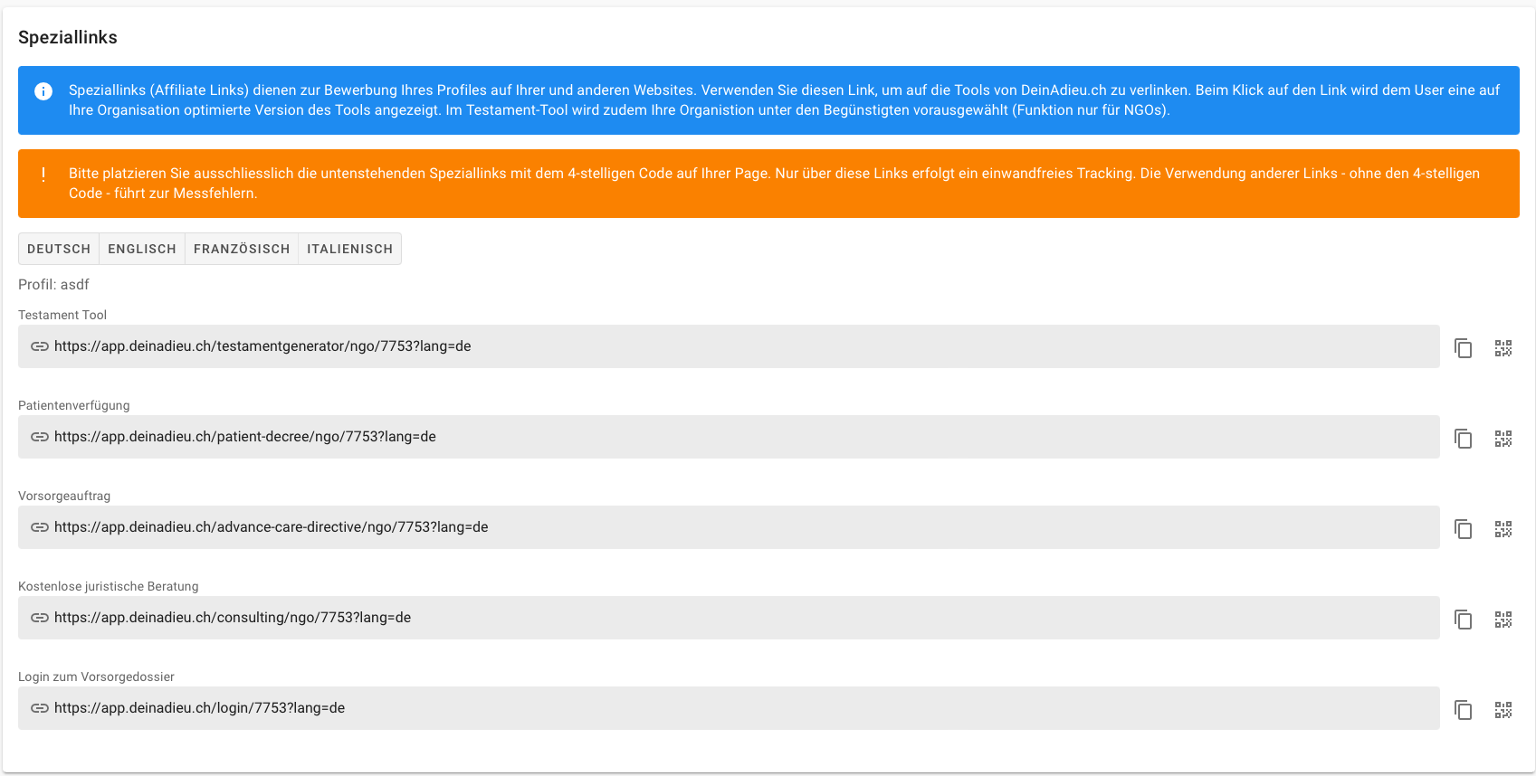 Der Speziallink für das Testament-Tool ist der wichtigste Speziallink. Nebst diesen stehen (je nach Land) weitere Speziallinks zur Verfügung: